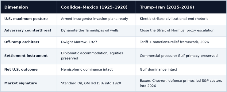 We told you the Mexico playbook would run again, and we told you the adversary in this decade would be Iran. Coolidge armed Mexican insurgents, prepared to invade, and faced Calles's order to dynamite the Tamaulipas oil wells rather than surrender them. Morrow's 1927 ambassadorship delivered the off-ramp that preserved American oil equities and kept the hemisphere intact, even the 1938 Cárdenas nationalization was settled at $24 million against far greater real value.