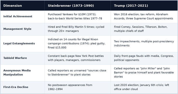 One behavioral overlap deserves special attention. Steinbrenner was notorious for phoning journalists as an anonymous source, when reporters wrote "sources close to George Steinbrenner say Lou Piniella is in danger of losing his job," it was widely understood the source was Steinbrenner himself. Trump employed the identical tactic throughout the 1980s and 1990s, calling reporters as "John Miller" or "John Barron" to lavish praise on himself and float business claims. Both men, in the same city, during the same era, independently developed the same media manipulation strategy — or, more likely, one learned it from the other.