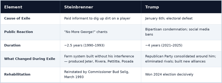 After January 6, 2021, a twice-impeached, electorally defeated president left Washington with a modest departure ceremony, vowing "We will be back in some form," before retreating to Mar-a-Lago. Like Steinbrenner, he was widely written off, banned from major social media platforms, facing multiple criminal indictments, with pundits across the political spectrum declaring his career over.