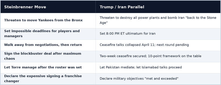 The current Iran conflict provides a real-time test case for applying the Steinbrenner framework. Steinbrenner's approach to every major negotiation followed a consistent pattern: open with maximum intimidation, set artificial deadlines, walk away entirely, then return with leverage amplified by the opponent's fear of permanent rupture, and finally close the blockbuster deal while letting the professionals manage the details.