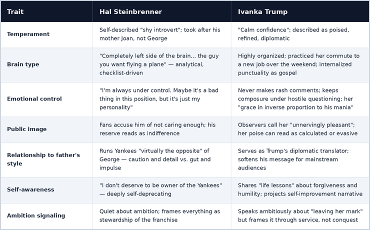 Both Ivanka Trump and Hal Steinbrenner inherited empires built by volcanic, larger-than-life fathers. Both have been defined, sometimes unfairly, by how they differ from those fathers. Hal told ESPN bluntly: "My dad and I are similar in some ways and we are different in some ways. We just have different personalities." Ivanka has navigated the same dynamic, serving as what Huffington Post called the "polished counterweight to Donald's brash and combative personality."