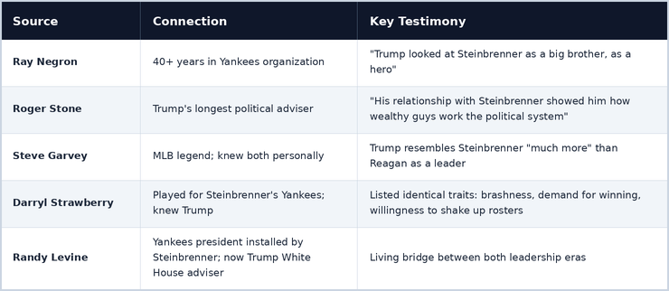 The failure of political analysts, media commentators, intelligence agencies, and foreign governments to systematically study the Trump-Steinbrenner connection represents a significant blind spot. Trump has told the world who his model is. The people who knew Steinbrenner best, Negron, Stone, Garvey, Strawberry, Levine have confirmed it repeatedly. The behavioral patterns match at granular levels: the pseudonyms, the firing cycles, the negotiation-by-intimidation, the exile-to-dynasty arc.