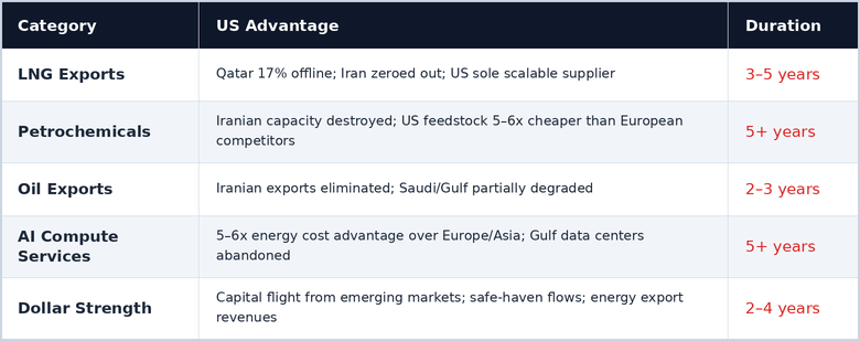 By April 2026, the conventional narrative on the Iran war is dead wrong. Wall Street is pricing this conflict as a risk event — higher oil, inflation fears, consumer drag, recession odds ticking up. But beneath the headline anxiety, the United States is quietly assembling the most dominant structural economic advantage since the post-WWII Bretton Woods order. Every missile that degrades Iranian infrastructure, every day the Strait of Hormuz stays constricted, and every month Qatar's shattered LNG trains sit idle widens a competitive moat around the US economy that will persist for five years or more — across energy, petrochemicals, and the explosive growth category of AI-powered digital services.