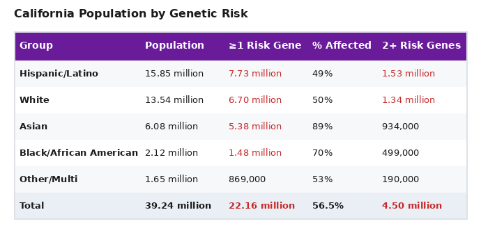 Based on published genetic data from major genome databases, here's what the numbers look like for California's 39.2 million residents: