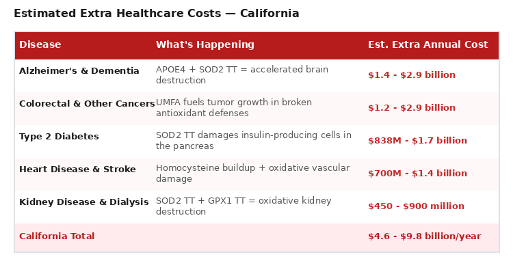 More than 22 million Californians, and 175 million Americans, carry genes that make synthetic folic acid a potential driver of the very diseases that are bankrupting our healthcare system. The science is clear, the genetic data is published, and the alternative (methylfolate) already exists. Every year we delay the switch, we add billions in avoidable healthcare costs and untold human suffering.